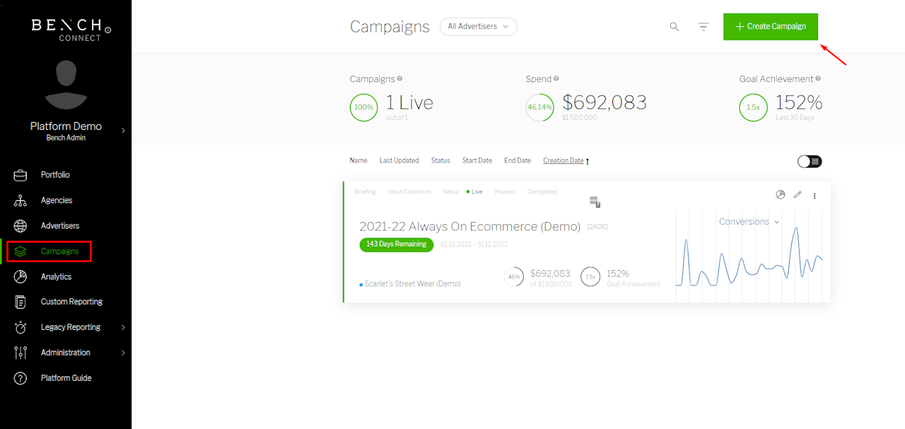 To get started, navigate to the ‘Campaigns’ screen from the left hand navigation menu and click ‘Create Campaign’.