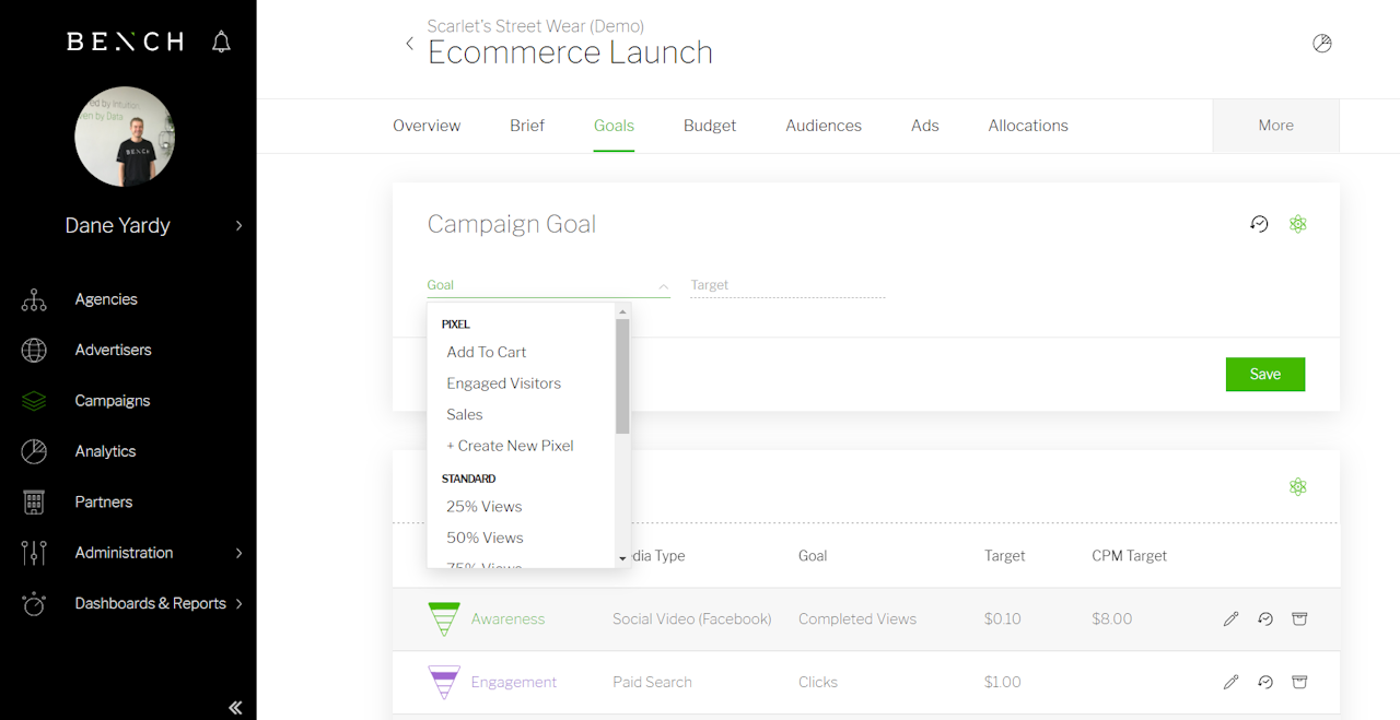 Using Bench Connect’s Goal management system will enable you to track and measure the performance of your campaign against predetermined benchmarks. All reporting dashboards are configured to report against the goals defined in the ‘Goals’ tab within your Campaign.
