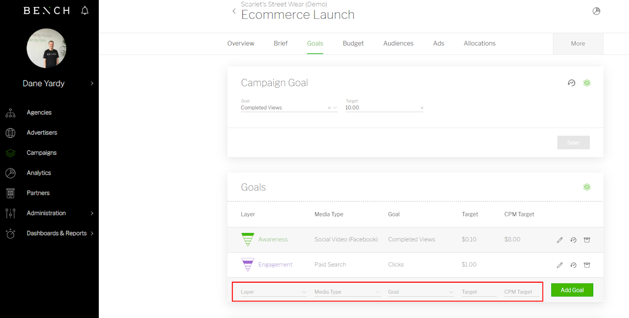 For each Media Type within each Layer that is activated through Bench Connect, a Media Type Goal should be assigned. The selected Goal and Target will be used to populate all reporting and KPI tracking interfaces within the platform.