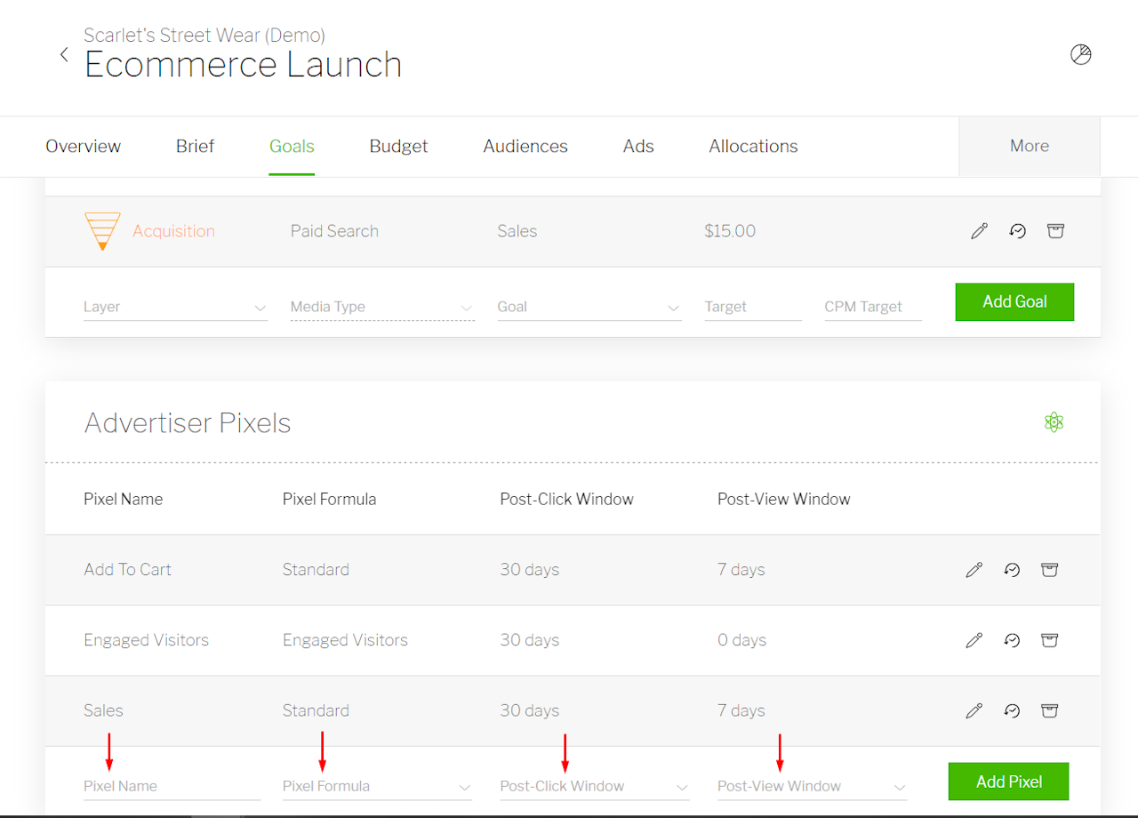 If you intend to set either your Campaign Goal or your Media Type Goals to track a pixel-based conversion, you’ll first need to define this Advertiser Pixel on the ‘Goals’ tab within your Campaign.