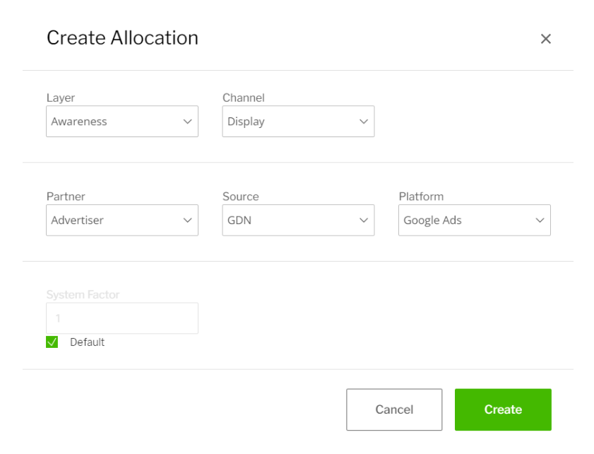 In order to add the channels and media types that are being run in the campaign, click the ‘+ Allocation’ button next to each layer. Here you can create an allocation, consisting of the following: