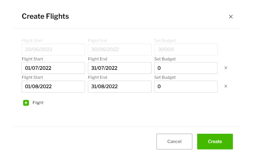 Flight dates cannot overlap with each other within an allocation. Click the ‘Create’ button to create new flights.